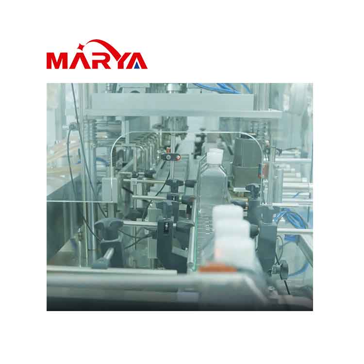 - Under the special process requirements of B+A, the bottle passes through the self-cleaning area and then enters the B-level area and finally enters the filling A-level area. First, the servo motor is used to loosen and shift the cap (the cap is still grasped on the capping head at this time) ), the filling head shifts and enters the bottle mouth to start filling, after filling, the filling head is reset, the capping head is reset again and completes the grab cap type capping and tightening cap under the rated torque.
