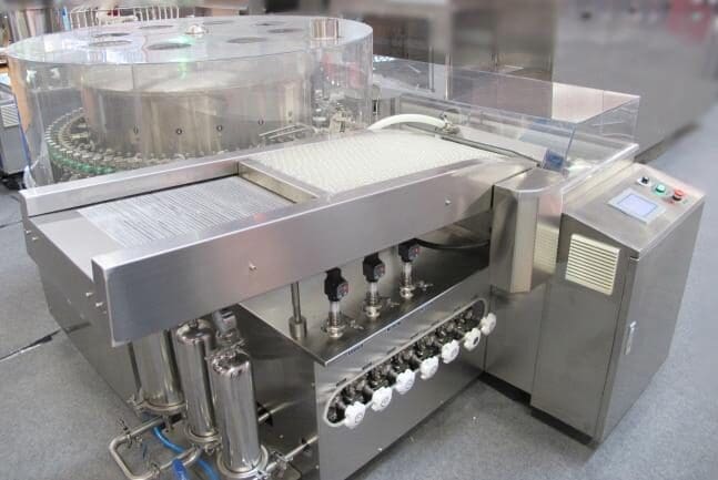 After the vials are poured, they enter the rough washing water tank for ultrasonic cleaning. After the rough washing is completed, they enter the fine washing process through the auger and the lifting cam. The inside of the bottle is cleaned with circulating water once, compressed air twice, compressed air once, injection water once, compressed air twice, and compressed air three times. At the same time, the outer wall of the bottle is washed with circulating water once and compressed air once. Then the bottle is taken out synchronously to complete the whole cleaning process.